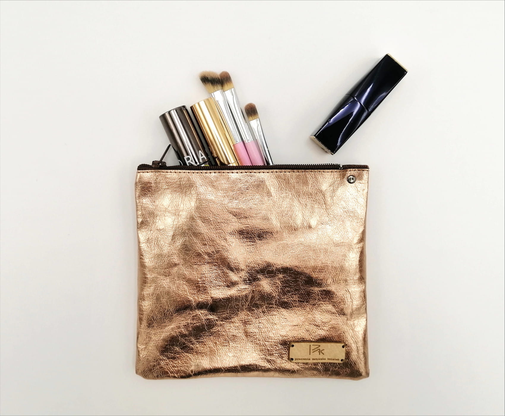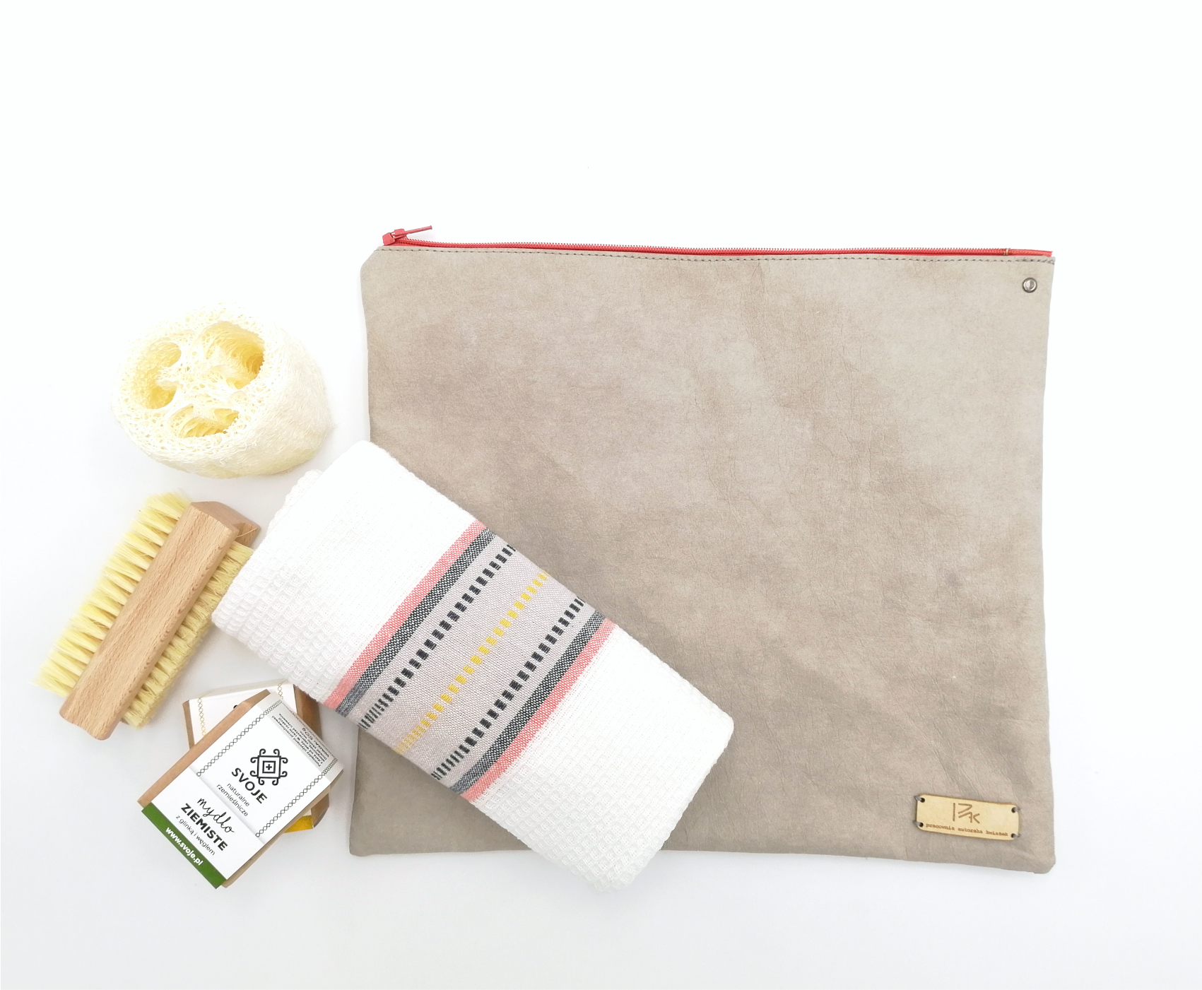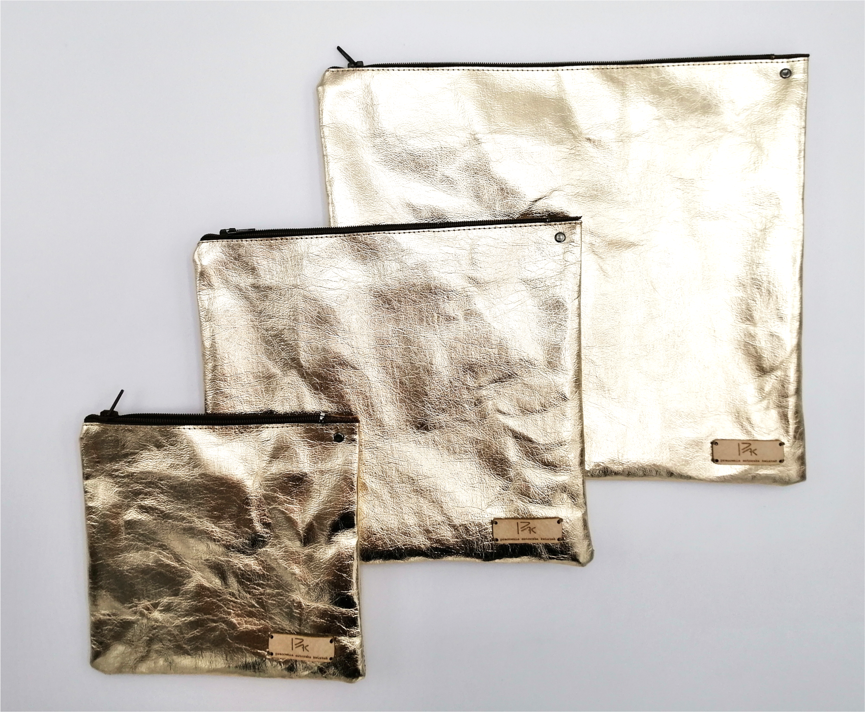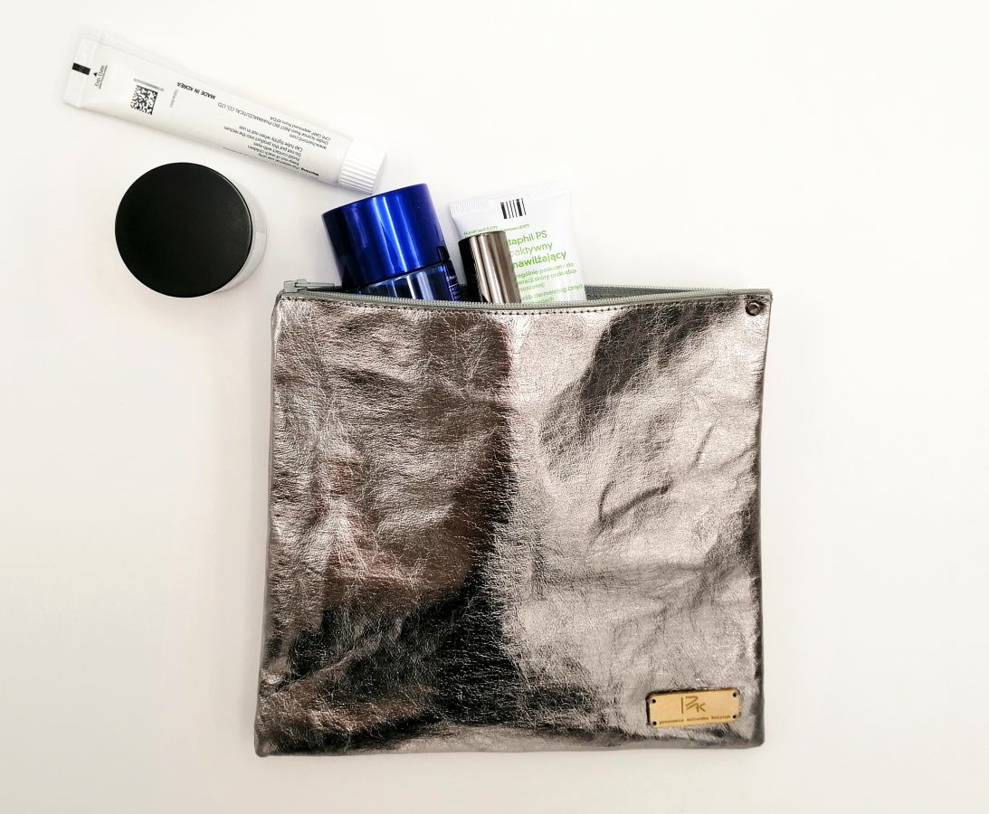 Kosmetyczki w wyglądzie i w dotyku przypominają skórę - wykonane z włókien celulozy i lateksu (ten materiał to tzw. skóra wegańska). Są wytrzymałe - w przypadku zabrudzenia materiał można prać w max 30 stopni (drobne zabrudzenia należy zmywać gąbeczką lub szmatką)